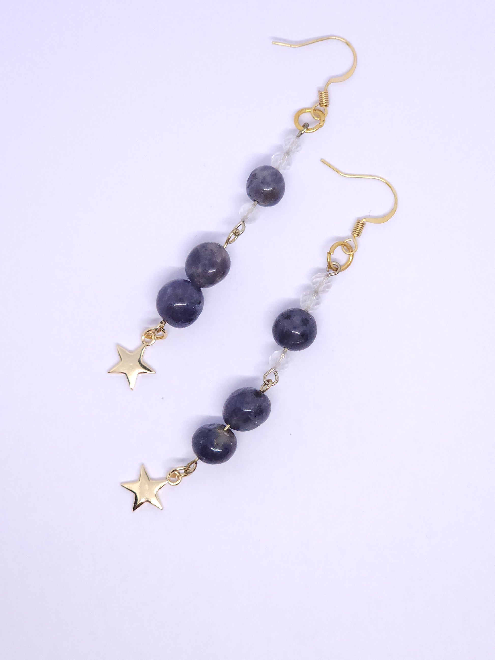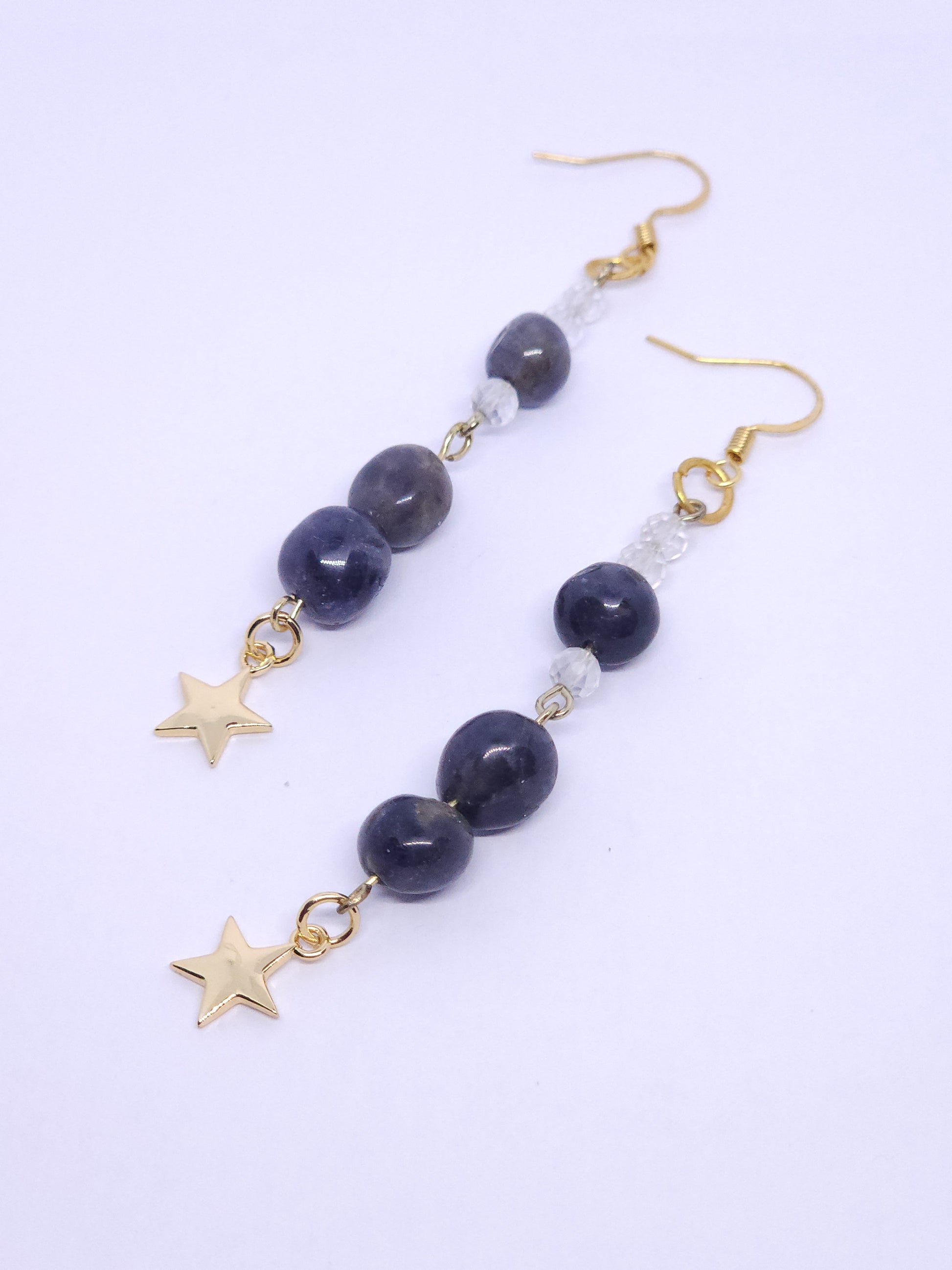 - These dangle earrings exude a celestial charm, enhancing any outfit with their deep blue Iolite stones, shimmering Clear Quartz, and a whimsical star charm dangling at the end.