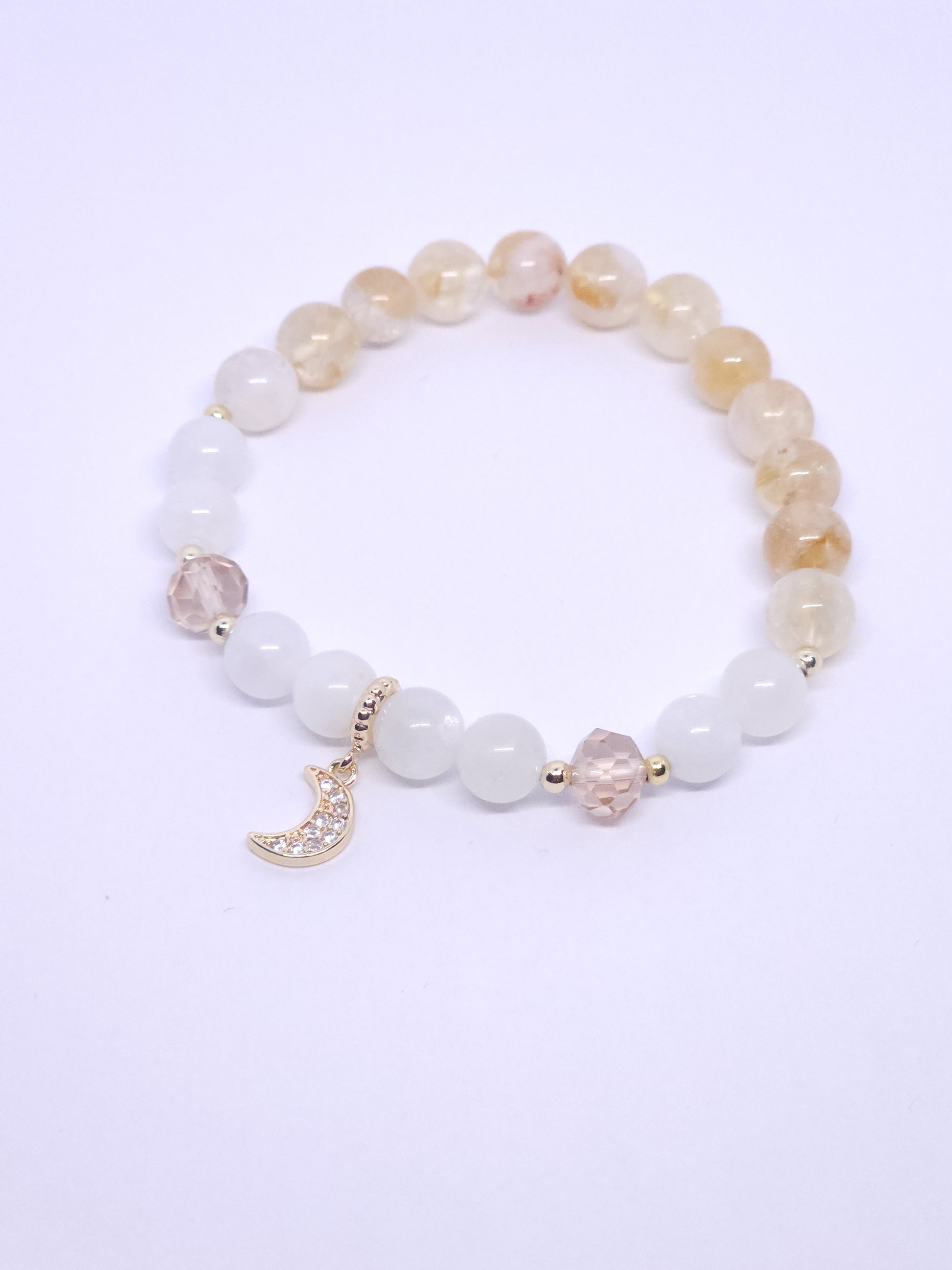 - Embrace the mystical energies of moonstone, the joyful essence of milky citrine, and the enchanting allure of the moon charm as you wear this bracelet, fostering a sense of inner harmony, positivity, and connection to the cosmos.