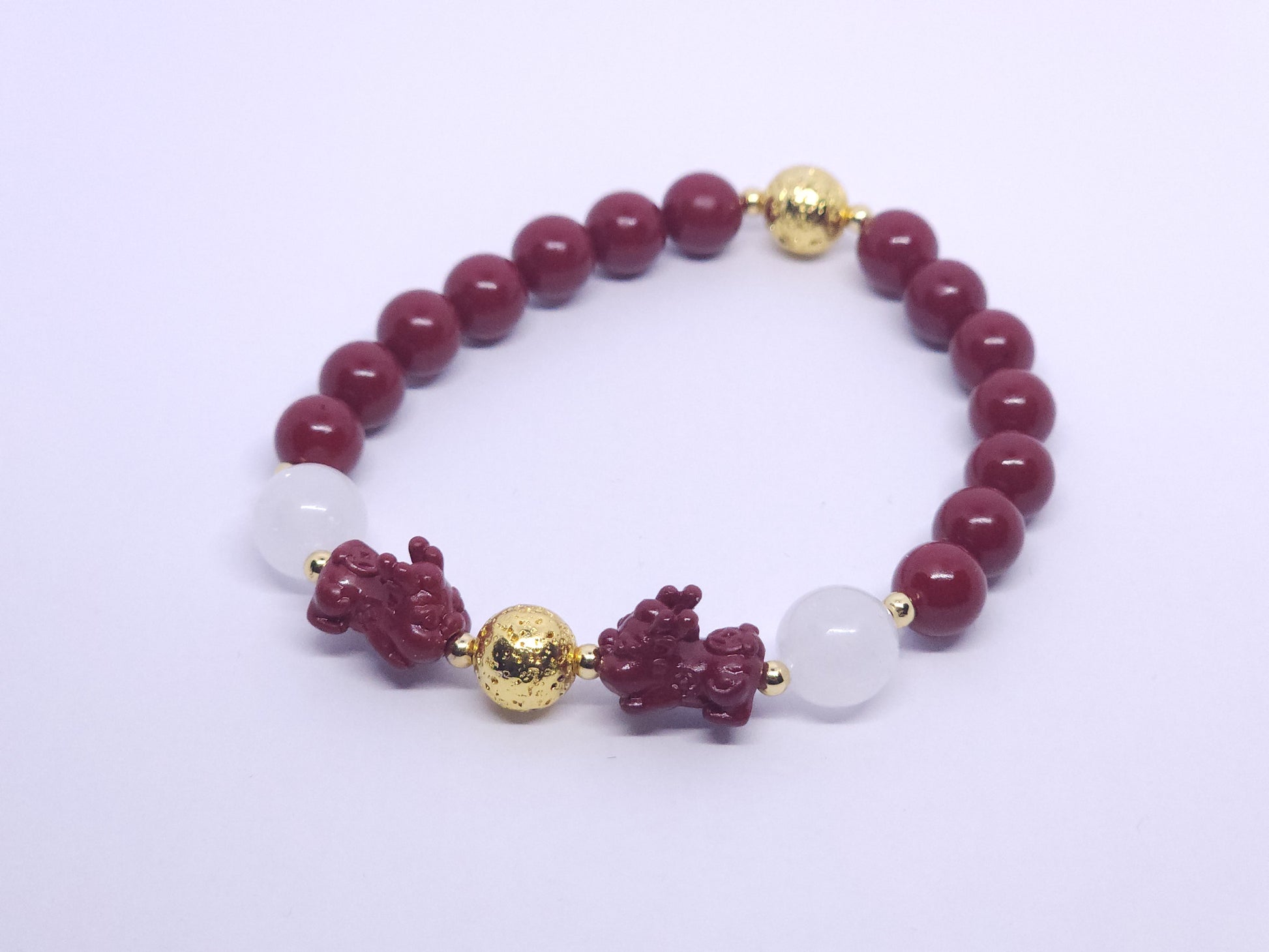 - Embrace the transformative energies of cinnabar, coupled with the calming essence of white jade, and feel the powerful presence of the cinnabar pixiu as you wear this bracelet, fostering a sense of vitality, inner harmony, and abundance.