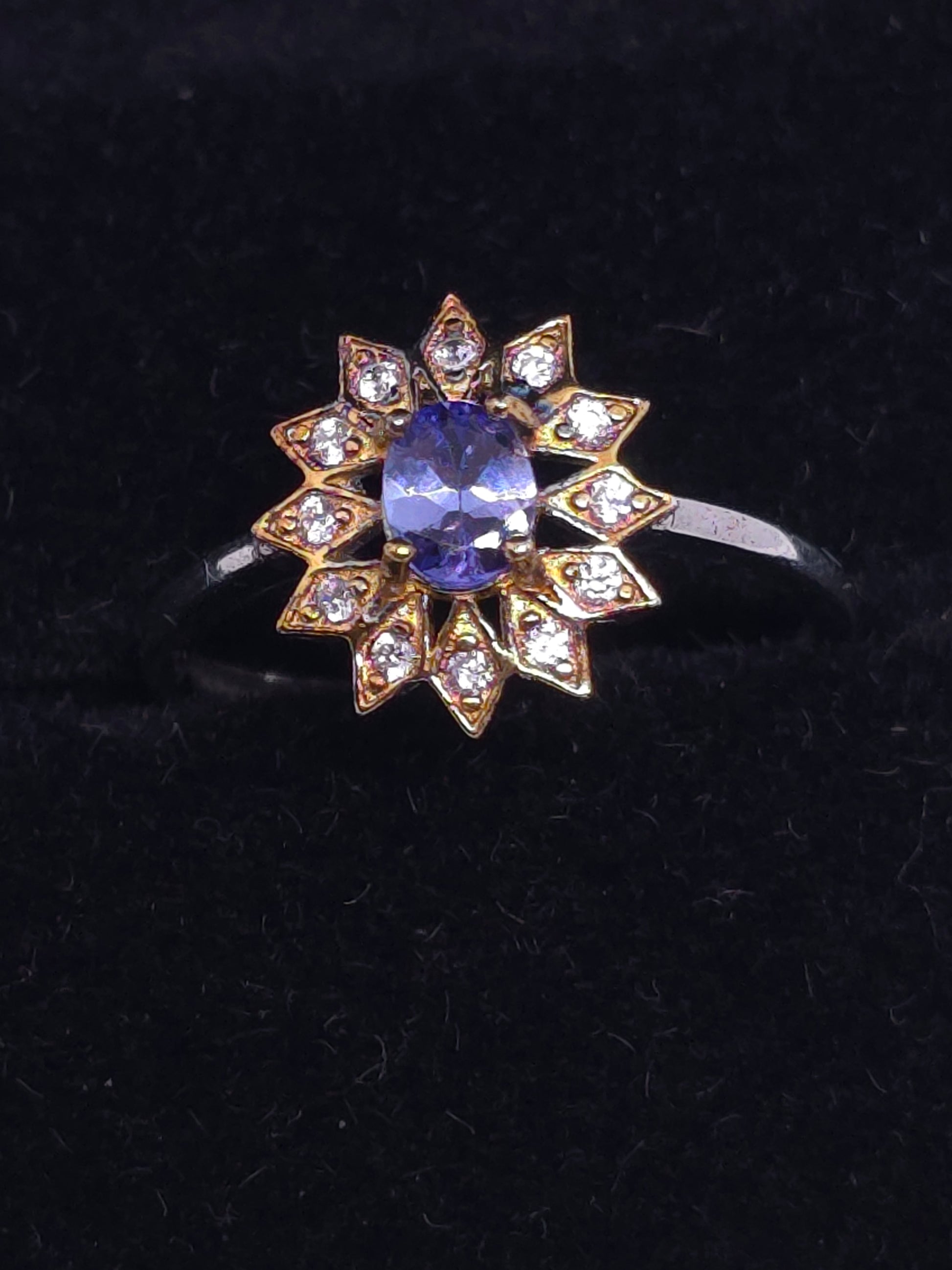 Encircling the tanzanite is a radiant flower-shaped halo, adorned with shimmering cubic zirconia stones that enhance its brilliance and add a touch of glamour. The intricate petal design, finished in a delicate gold-tone accent, creates a striking contrast, making this ring a true statement piece.