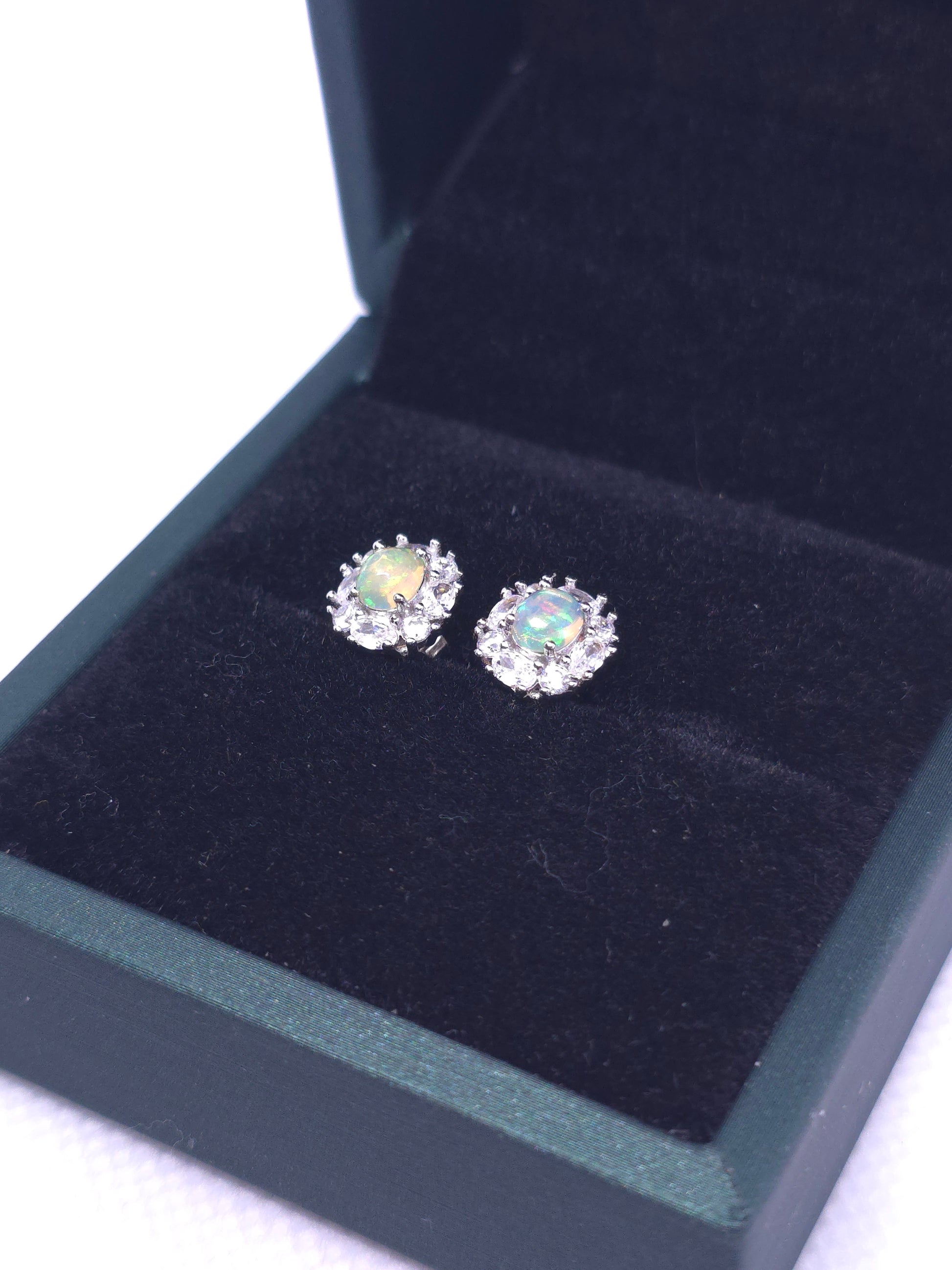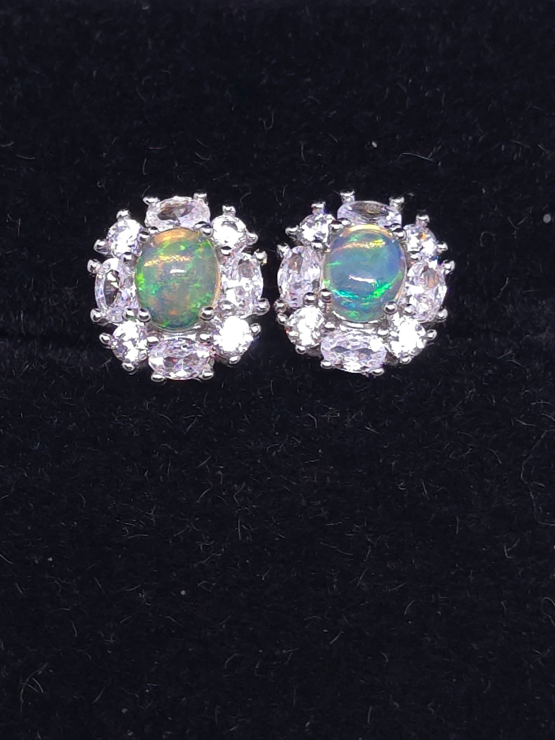 Each opal is set within a sparkling halo of cubic zirconia accents, adding brilliance and enhancing the gemstone's natural allure. Crafted with 925 sterling silver, these earrings are not only beautiful but also durable and versatile for everyday wear.
