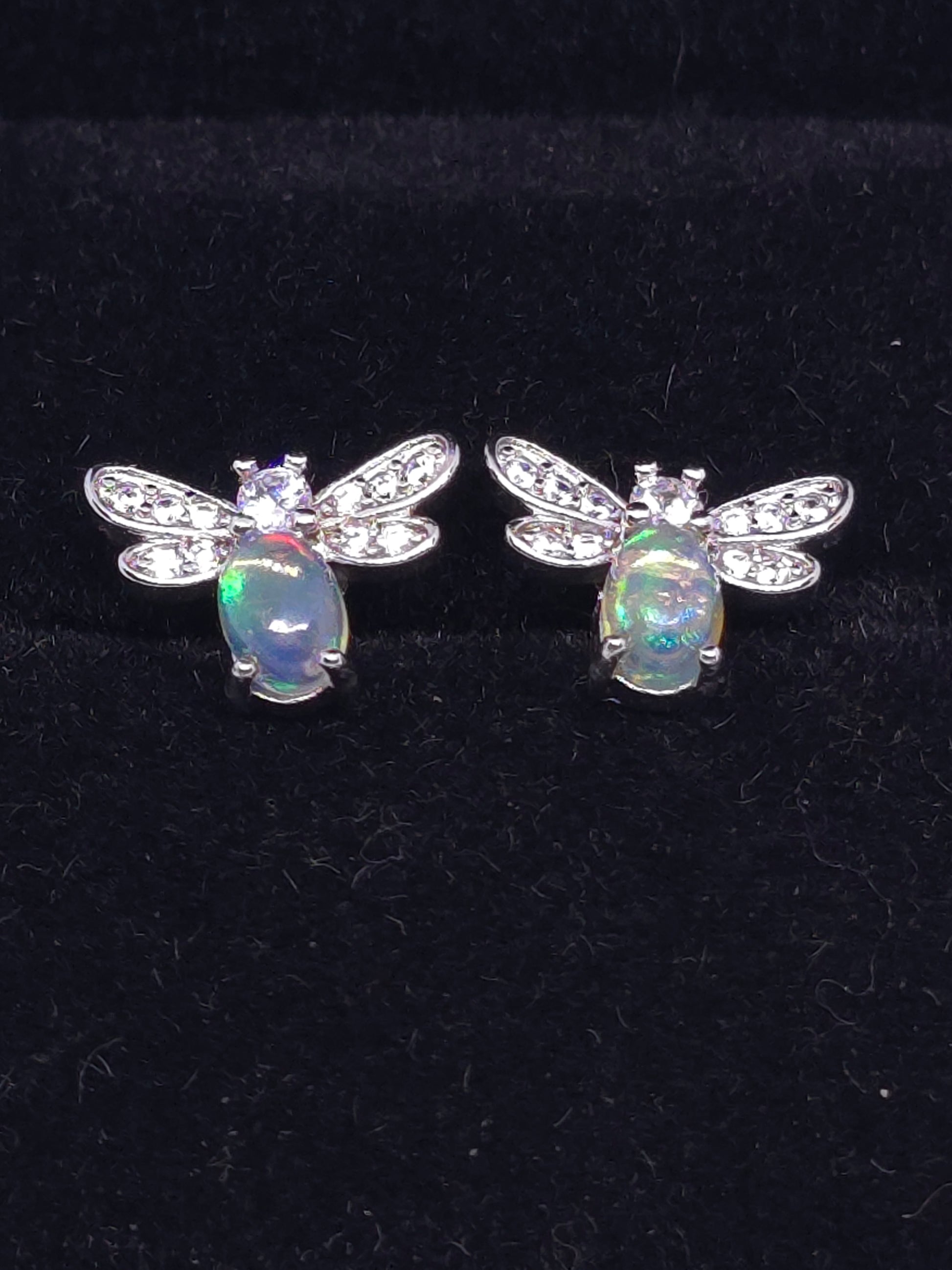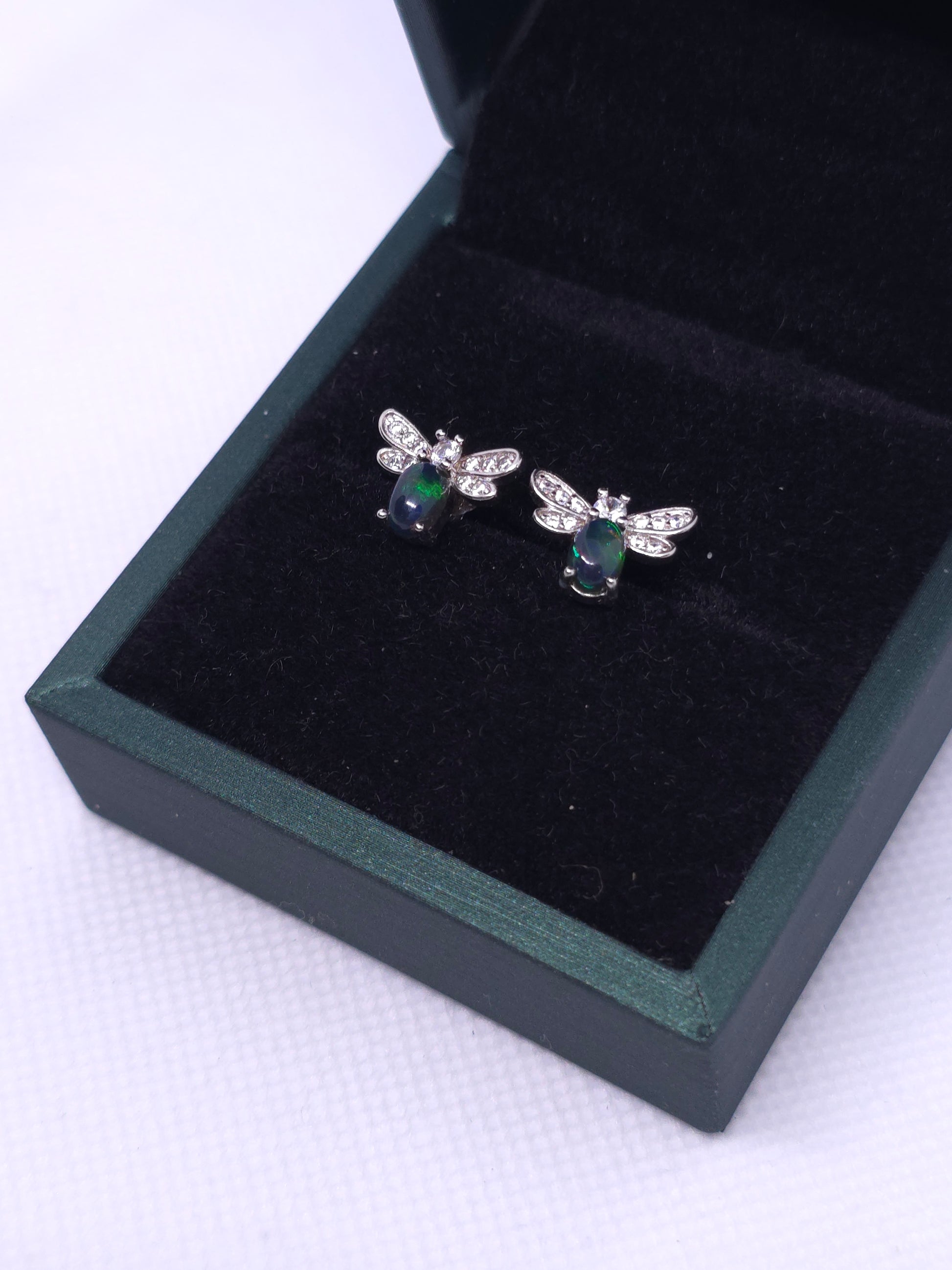 Each earring is shaped like a delicate firefly, featuring a luminous opal body available in your choice of ethereal white opal or mysterious black opal. The wings are adorned with sparkling cubic zirconia, adding a touch of brilliance that mirrors the shimmer of fireflies in the night. The sterling silver setting ensures durability, comfort, and a radiant finish that complements the intricate design.