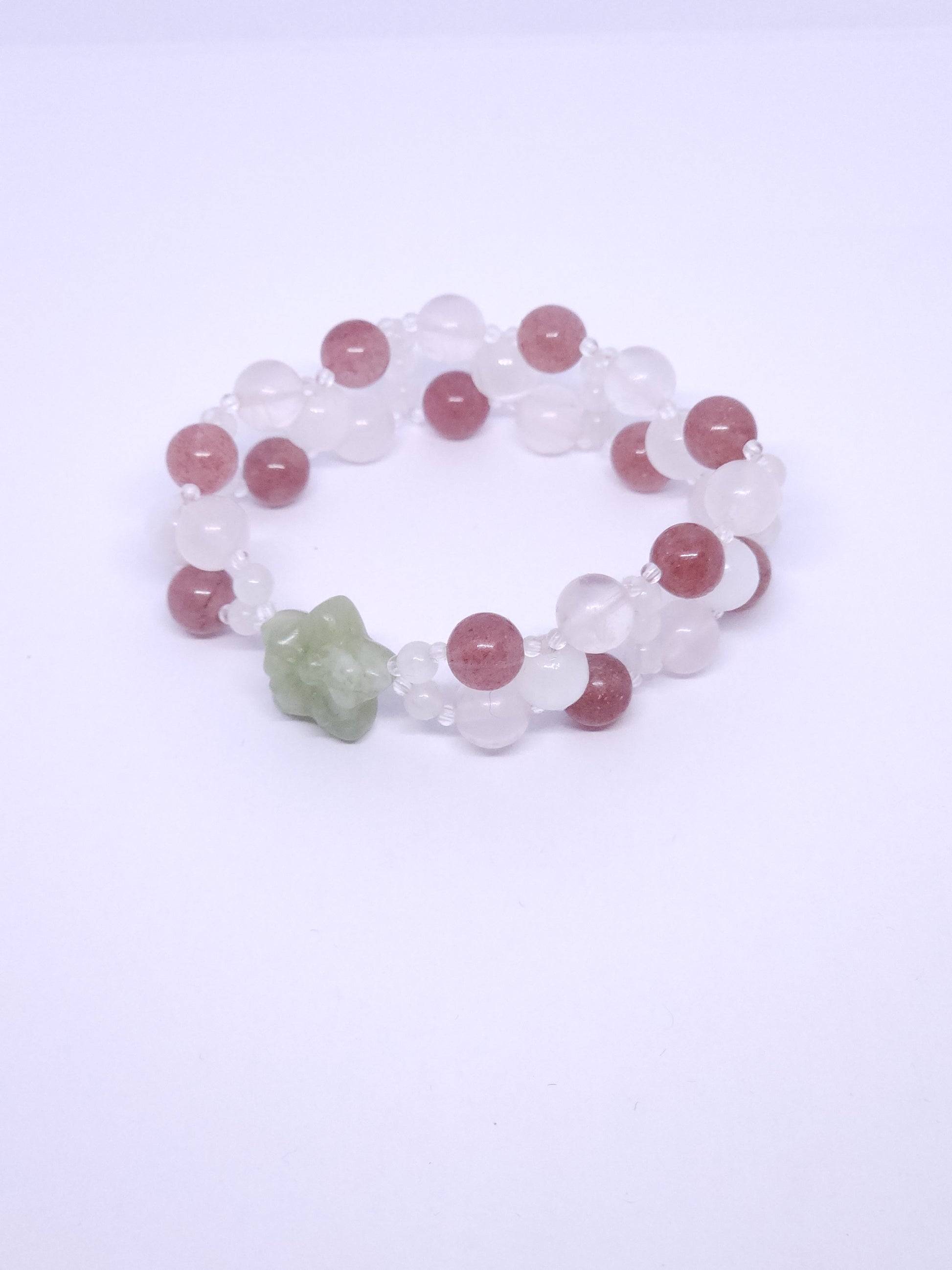 Introducing our enchanting Triple Bracelet with Rose Quartz, Strawberry Quartz, Selenite, and White Jade, featuring a captivating centerpiece: a Serpentine Jade carving of a star adorned with a delicate bow. This meticulously handcrafted piece weaves together the loving energies of rose quartz, the gentle charm of strawberry quartz, the soothing aura of selenite, and the serene purity of white jade.